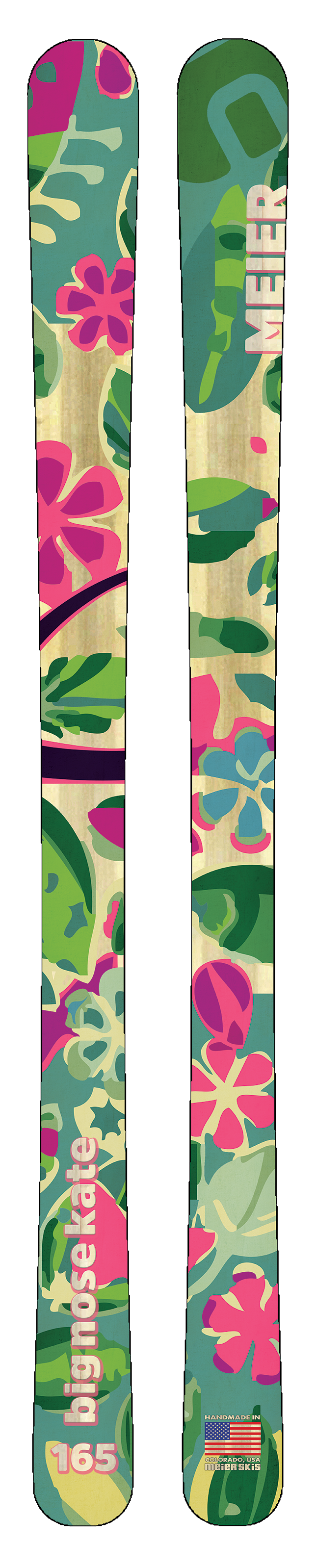 Turn heads on the mountain with this Big Nose Kate topsheet. This lively design bursts with oversized floral shapes in vivid pinks, greens, and teals, blending bold color with Meier’s signature wood grain for a natural warmth. Confident, fun, and full of personality, it’s made for skiers who like their runs as bright and fearless as their style.